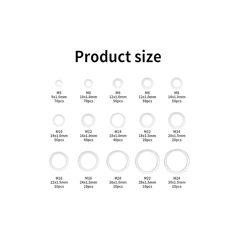 В комплект входит: 15 типов шайб стандартной спецификации от M5 до M24, всего 510 штук, с большим диапазоном размеров и широким спектром применения, что делает их идеальным выбором для промышленного использования.